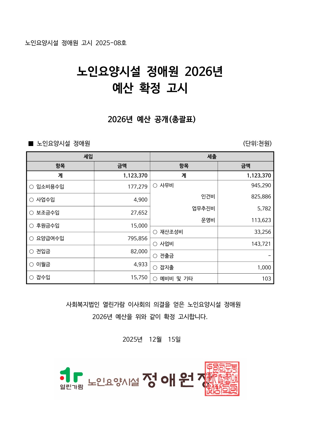 노인요양시설 정애원 2026년 초회 예산 확정고시