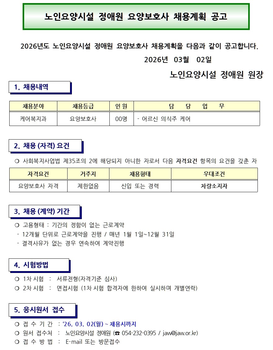 | 제목 | 2026년 3월 노인요양시설 정애원 요양보호사 채용공고 | 공지일 | 2026.03.02 |
